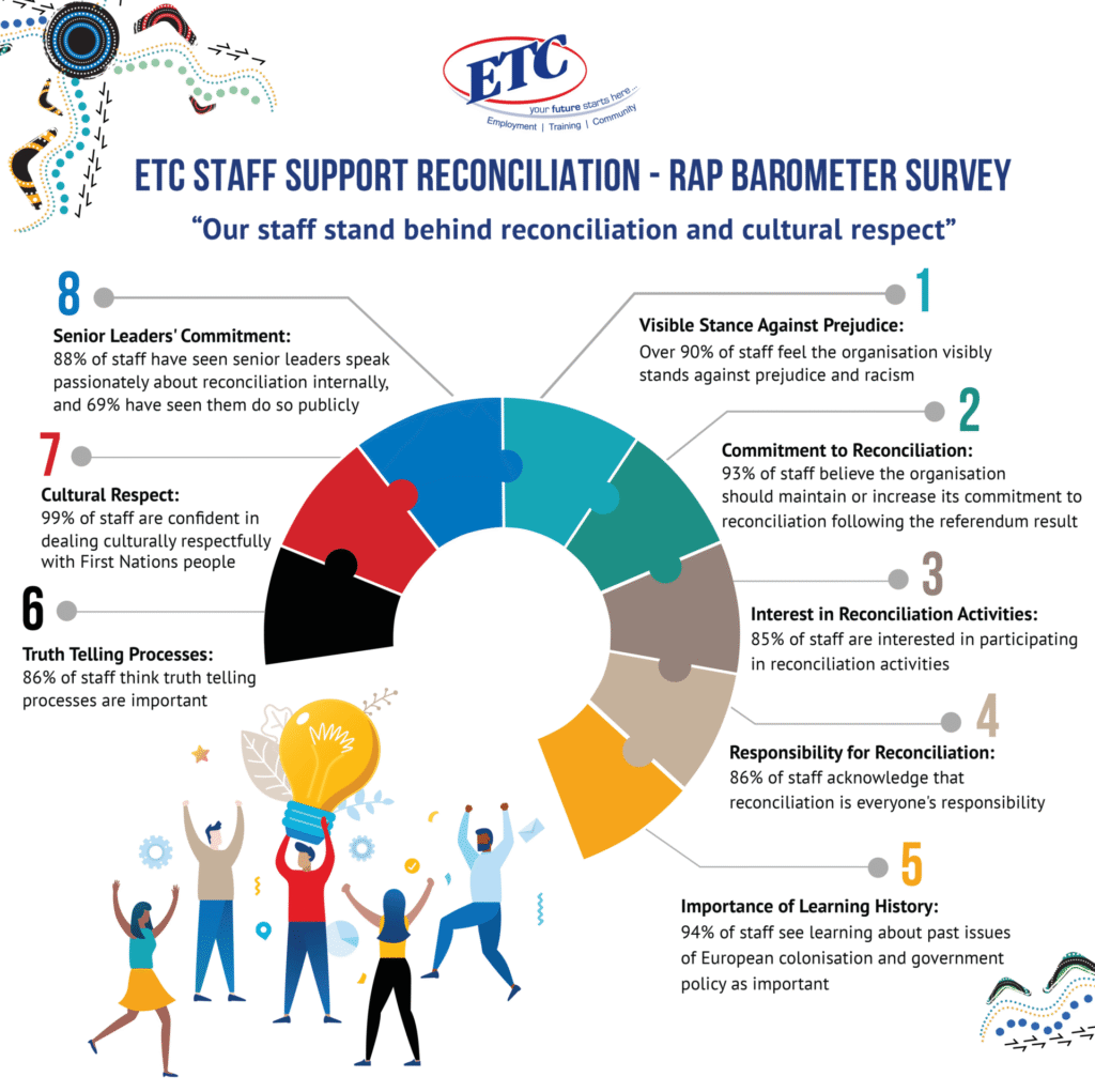 The RAP Barometer is a national survey that measures attitudes and actions around reconciliation in the workplace. ETC’s results show that staff are deeply engaged in the reconciliation journey: